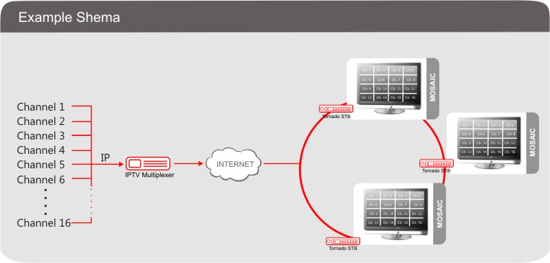 IPTV Multiplexer provides a single IPTV output channel in mosaic format. This channel is a compilation of all input channels and supports 2, 4, 9, 16 segment mosaic layouts.