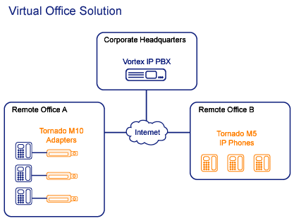 Virtual Office model is used by companies that want to consolidate their communications, reduce costs and achieve more cohesive corporate images. To implement the model, a company has to install a single IP PBX system in its headquarters and distribute to employees IP phones or regular phones with VoIP adapters. Employees can make intra-office and inter-office phone calls through dialing PBX extensions. Such calls are routed through the Internet and are practically free. Company customers, on the other side, can dial a single inbound number plus extensions in order to reach the company's employees. The latter receive the calls on their IP/Regular Phones at any location with Internet connectivity.